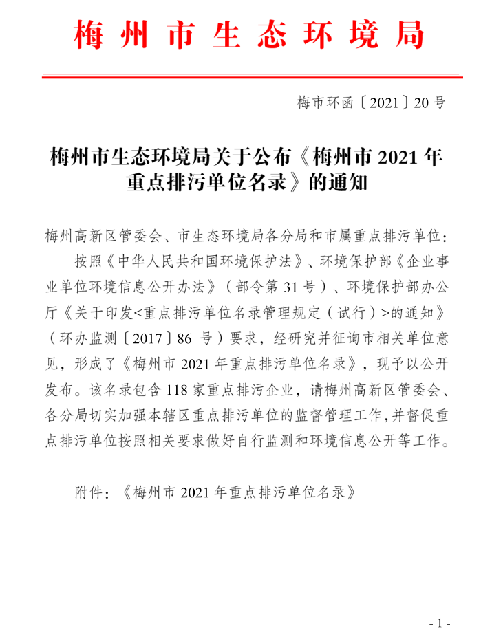 梅州市人民政府門戶網(wǎng)站 梅州市生態(tài)環(huán)境局 重點(diǎn)排污單位基本信息 梅州市生態(tài)環(huán)境局關(guān)于公布《梅州市2021年重點(diǎn)排污單位名錄》的通知
