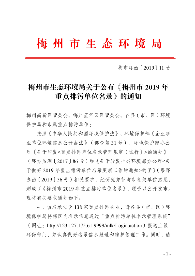 梅州市人民政府門戶網(wǎng)站 梅州市生態(tài)環(huán)境局 重點(diǎn)排污單位基本信息 梅州市環(huán)境保護(hù)局關(guān)于公布《梅州市2019年重點(diǎn)排污單位名錄》的通知