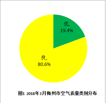 2018年3月份梅州市城區(qū)環(huán)境空氣質量有效監(jiān)測天數(shù)31天,數(shù)據(jù)有效率100%。環(huán)境空氣質量指數(shù)(AQI)范圍35~95,其中,空氣質量優(yōu)的天數(shù)6天,良的天數(shù)25天,優(yōu)良率為100%,同比持平;首要污染物為NO2、PM10、O3、PM2.5;城市環(huán)境空氣質量綜合指數(shù)為3.87,在全省21個地級市中排第11名。