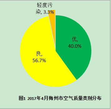 2017年4月份梅州市城區(qū)環(huán)境空氣質(zhì)量有效監(jiān)測(cè)天數(shù)30天,數(shù)據(jù)有效率100%。環(huán)境空氣質(zhì)量指數(shù)(AQI)范圍25-111,其中,空氣質(zhì)量優(yōu)的天數(shù)12天,良的天數(shù)17天,輕度污染的天數(shù)為1天;空氣質(zhì)量優(yōu)良率96.7%,同比持平;首要污染物為PM10、O3、PM2.5;城市環(huán)境空氣質(zhì)量綜合指數(shù)為3.60。