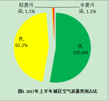 2017年上半年度梅州市城區(qū)環(huán)境空氣質(zhì)量有效監(jiān)測天數(shù)181天。AQI范圍22-188,其中,空氣質(zhì)量優(yōu)的天數(shù)為95天,良的天數(shù)83天,輕度污染1天,中度污染1天,優(yōu)良天數(shù)比例98.3%,同比上升0.5個百分點。上半年城市環(huán)境空氣質(zhì)量綜合指數(shù)為3.48,在全省21個地級市中排第9名。