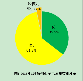 2018年1月份梅州市城區(qū)環(huán)境空氣質(zhì)量有效監(jiān)測(cè)天數(shù)31天,數(shù)據(jù)有效率100%。環(huán)境空氣質(zhì)量指數(shù)(AQI)范圍26~114,其中,空氣質(zhì)量?jī)?yōu)的天數(shù)10天,良的天數(shù)21天,輕度污染1天,優(yōu)良率為96.8%,同比持平;首要污染物為NO2、PM10、PM2.5;城市環(huán)境空氣質(zhì)量綜合指數(shù)為4.02,在全省21個(gè)地級(jí)市中排第6名。