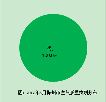 2017年6月份梅州市城區(qū)環(huán)境空氣質(zhì)量有效監(jiān)測天數(shù)30天,數(shù)據(jù)有效率100%。環(huán)境空氣質(zhì)量指數(shù)(AQI)范圍22-48,空氣質(zhì)量均為優(yōu);空氣質(zhì)量優(yōu)良率100%,同比持平;城市環(huán)境空氣質(zhì)量綜合指數(shù)為2.18。