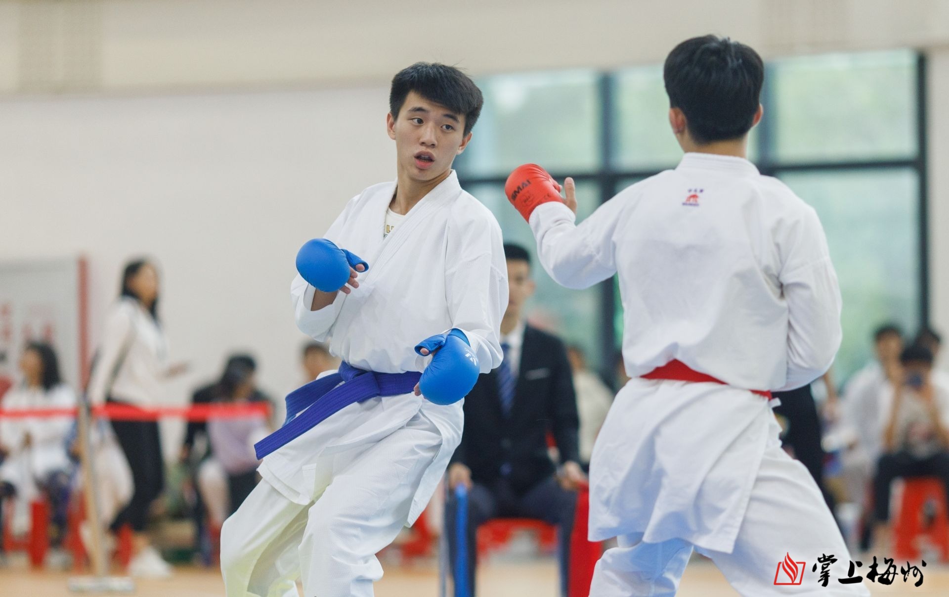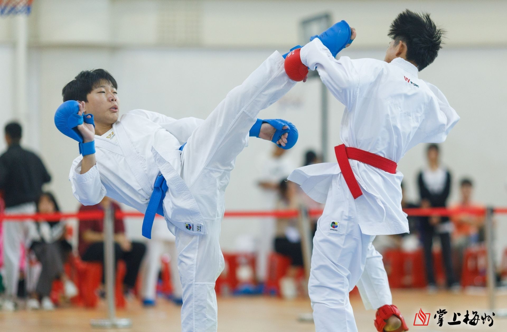 市運(yùn)會空手道男子乙組50KG級決賽,參賽選手激烈比拼。(林翔 攝)