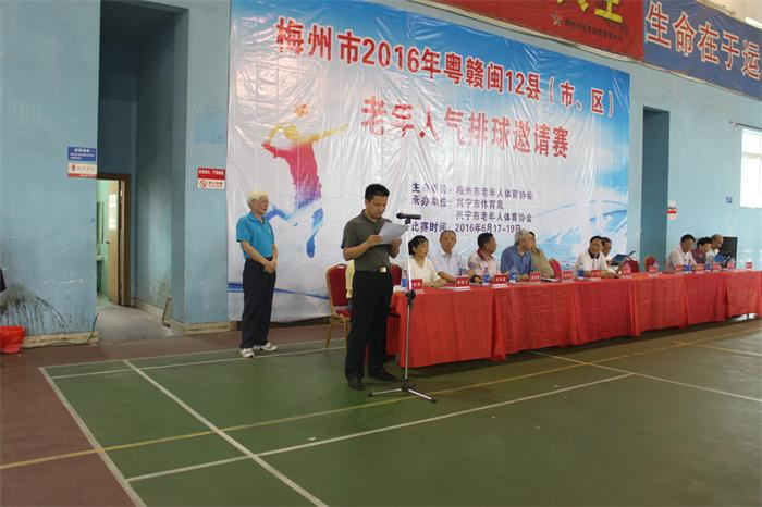 由梅州市老年人體育協(xié)會主辦、興寧市體育局、興寧市老年人體育協(xié)會承辦的梅州市2016年粵贛閩12縣(市、區(qū))老年人氣排球邀請賽于2016年6月17日—19日在興寧市體育綜合訓(xùn)練館舉行,來自江西尋烏、福建武平、廣東揭陽以及梅州各市、縣區(qū)共23支男、女代表隊近200名隊員參加角逐。17日下午3時舉行開幕式,開幕式由梅州市老體協(xié)常務(wù)副主席陳珍書同志主持,興寧市人民政府副市長彭志洪同志致歡迎詞,梅州市老體協(xié)主席劉廣新同志講話,介紹了本次比賽的籌辦等有關(guān)情況,最后由梅州市老體協(xié)名譽主席何萬真同志宣布比賽開始。