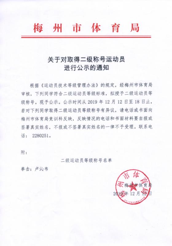 梅州市人民政府門戶網(wǎng)站 梅州市體育局 通知公告 對取得二級稱號運動員進行公示的通知