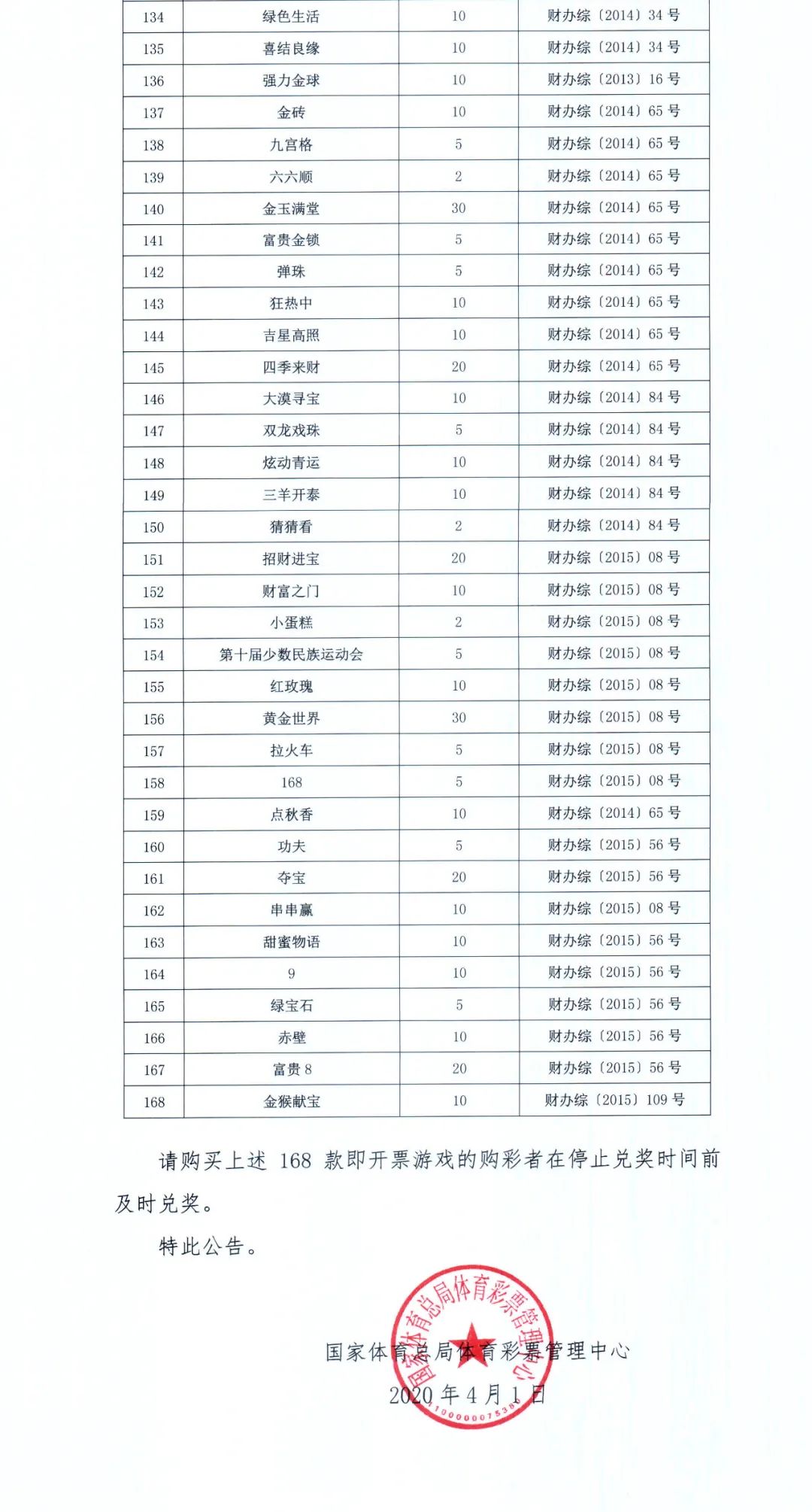 體育總局彩票中心關(guān)于停止銷售“年年有魚”等 168款即開型體育彩票游戲的公告