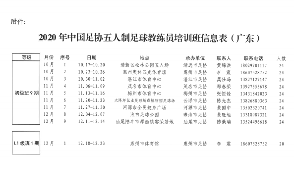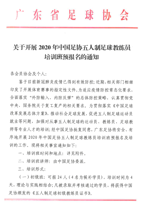 為促進五人制足球運動發(fā)展,培養(yǎng)優(yōu)秀的五人制足球教練員,經(jīng)中國足球協(xié)會、廣東省足球協(xié)會授權(quán),由梅州市足球運動中心、梅州市足球協(xié)會主辦,擬于2020年11月在梅州市開展2020年中國足協(xié)五人制足球教練員培訓(xùn)班。初級班考核通過者,可獲得中國足協(xié)頒發(fā)的《五人制足球初級教練員證書》;L1級班考核通過者,可獲得亞足聯(lián)/中國足協(xié)頒發(fā)的《室內(nèi)五人制足球L1級教練員證書》。