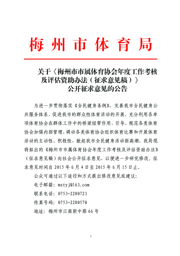 梅州市人民政府門戶網(wǎng)站 梅州市體育局 通知公告 關(guān)于公開征求《梅州市市屬體育協(xié)會年度工作考核及評估資助辦法(
