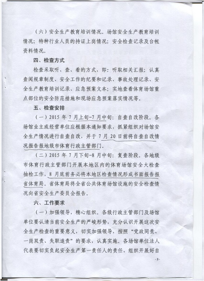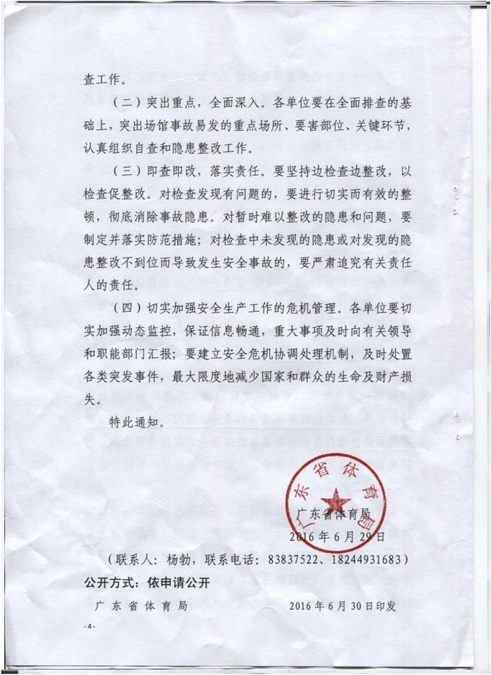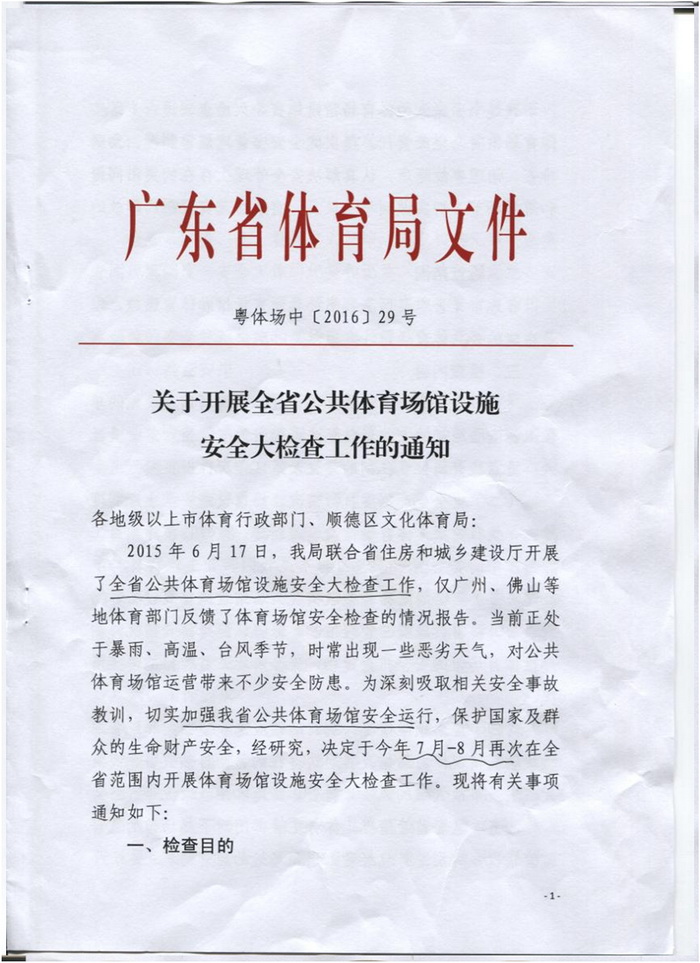 現(xiàn)將省體育局《關(guān)于開(kāi)展全省體育場(chǎng)館設(shè)施安全大檢查工作的通知》(粵體場(chǎng)中〔2016〕29號(hào))轉(zhuǎn)發(fā)給你們,請(qǐng)認(rèn)真貫徹執(zhí)行。請(qǐng)抓緊時(shí)間組織對(duì)轄區(qū)內(nèi)體育場(chǎng)館安全生產(chǎn)情況進(jìn)行自查自改,并將自查自改情況報(bào)告于7月25日前報(bào)市體育局。