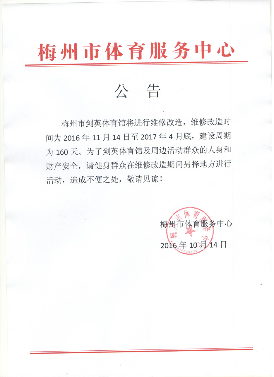 梅州市人民政府門戶網(wǎng)站 梅州市體育局 通知公告 梅州市劍英體育館維修改造公告