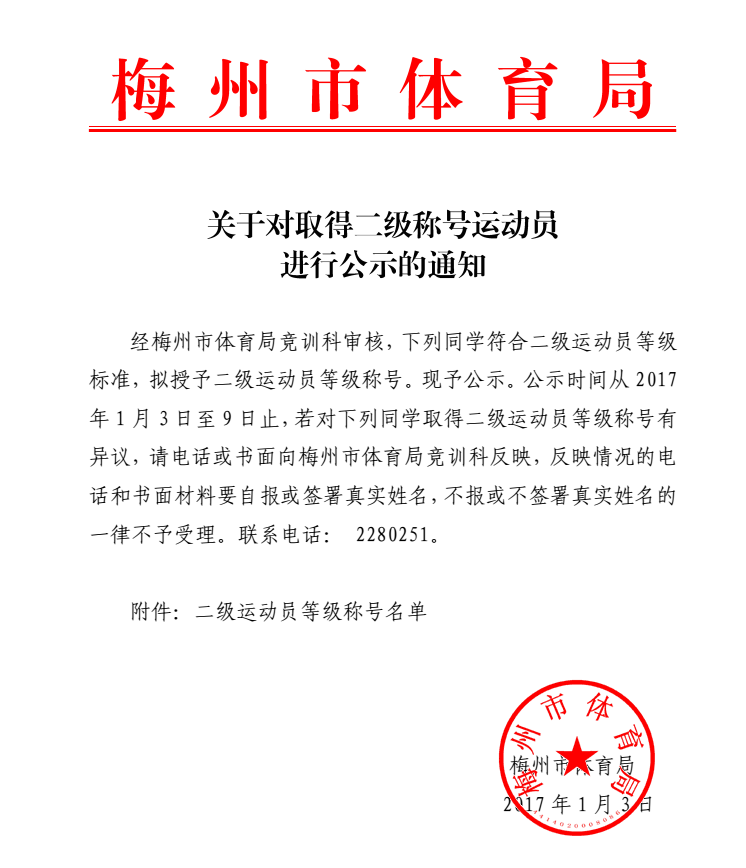 梅州市人民政府門戶網(wǎng)站 梅州市體育局 通知公告 關(guān)于對取得二級稱號運(yùn)動員進(jìn)行公示的通知