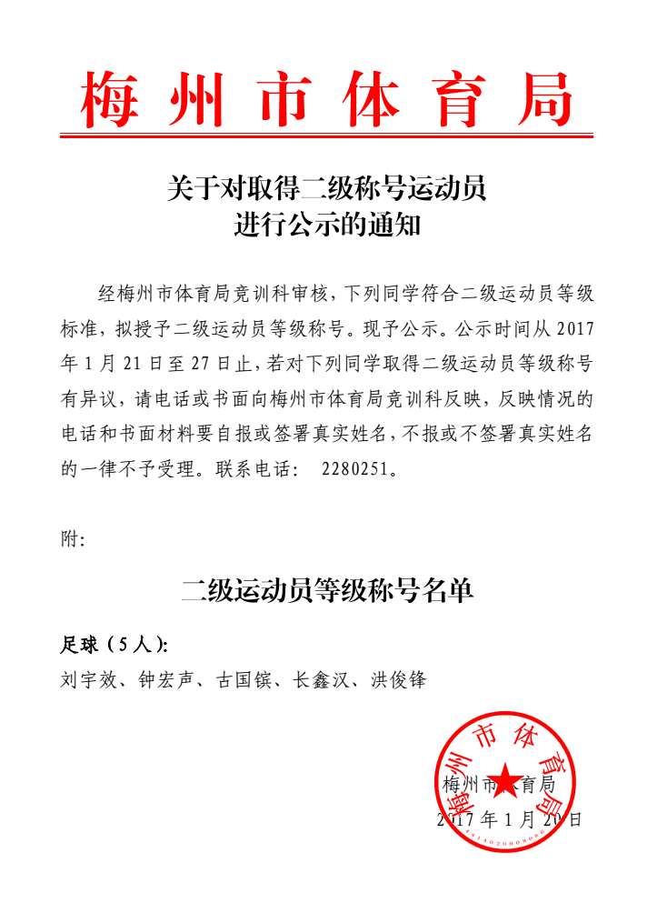 梅州市人民政府門戶網(wǎng)站 梅州市體育局 通知公告 關(guān)于對(duì)取得二級(jí)稱號(hào)運(yùn)動(dòng)員進(jìn)行公示的通知(足球)