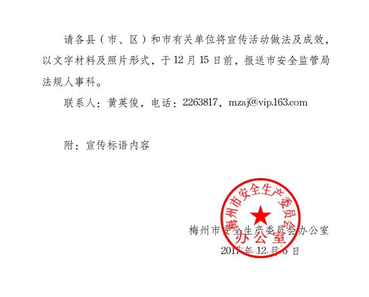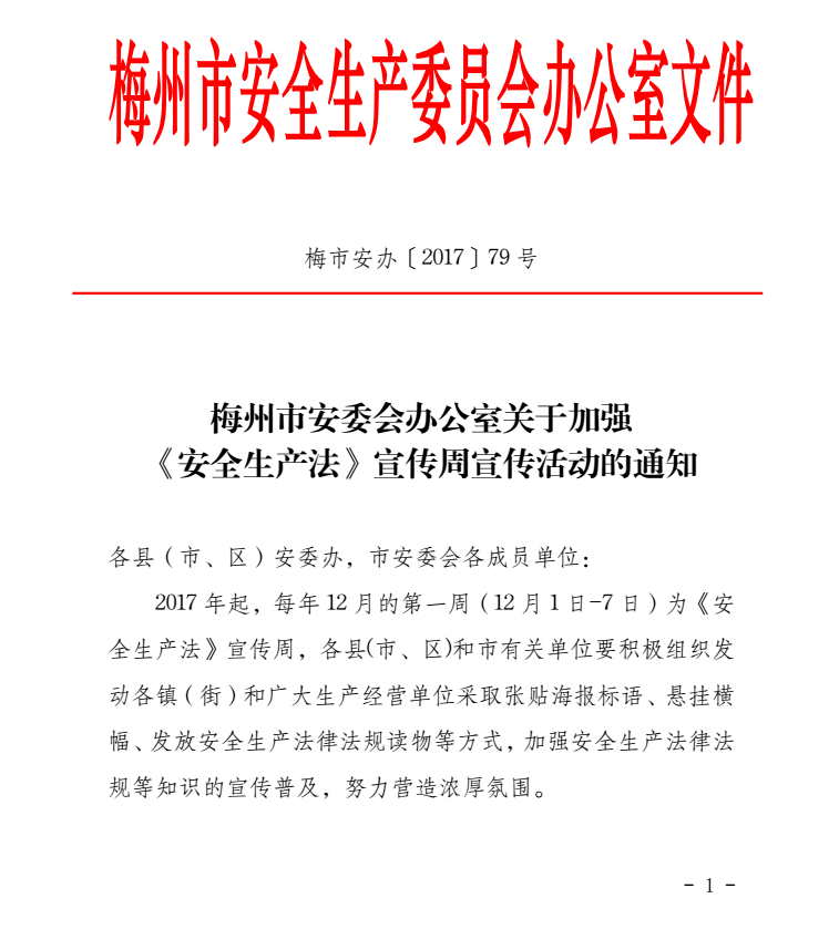 梅州市人民政府門戶網(wǎng)站 梅州市體育局 通知公告 梅州市安委會(huì)辦公室關(guān)于加強(qiáng) 《安全生產(chǎn)法》 宣傳周宣傳活動(dòng)的通知