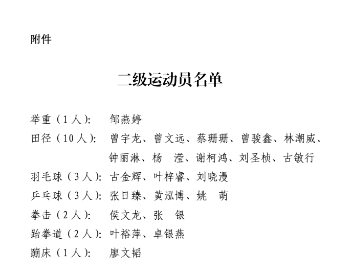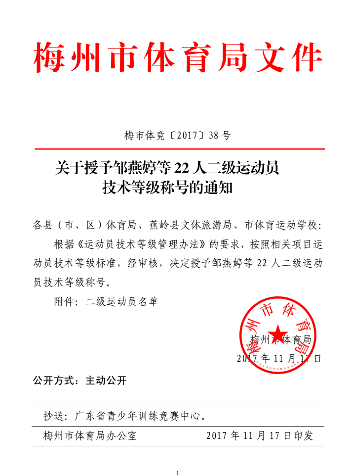 梅州市人民政府門戶網(wǎng)站 梅州市體育局 通知公告 關(guān)于授予鄒燕婷等22人二級(jí)運(yùn)動(dòng)員技術(shù)等級(jí)稱號(hào)的通知