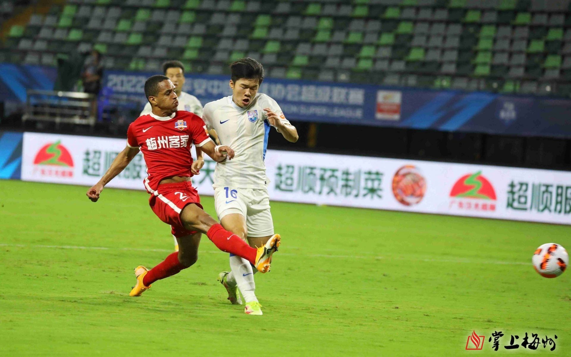 第13分鐘,梅州客家在反擊中攻進中超首粒進球,巴西外援羅德里格持球突入禁區(qū),擺脫防守隊員一腳中的。(林翔 攝)