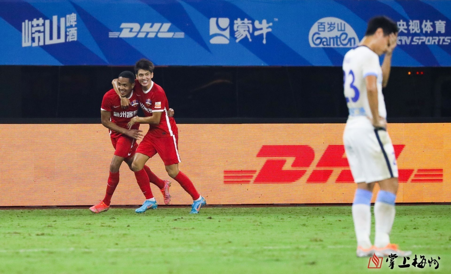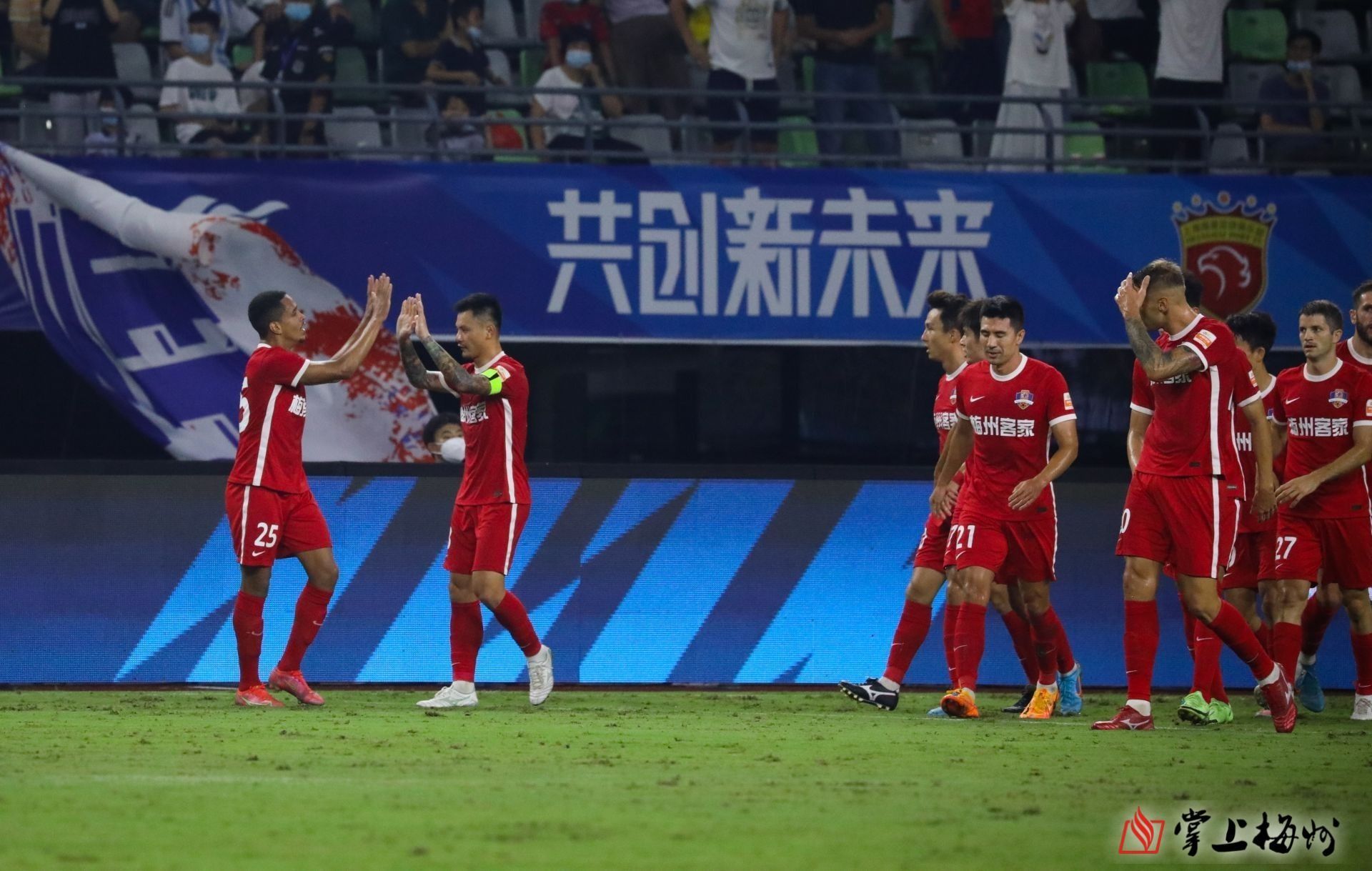 梅州客家隊球員慶祝進球。