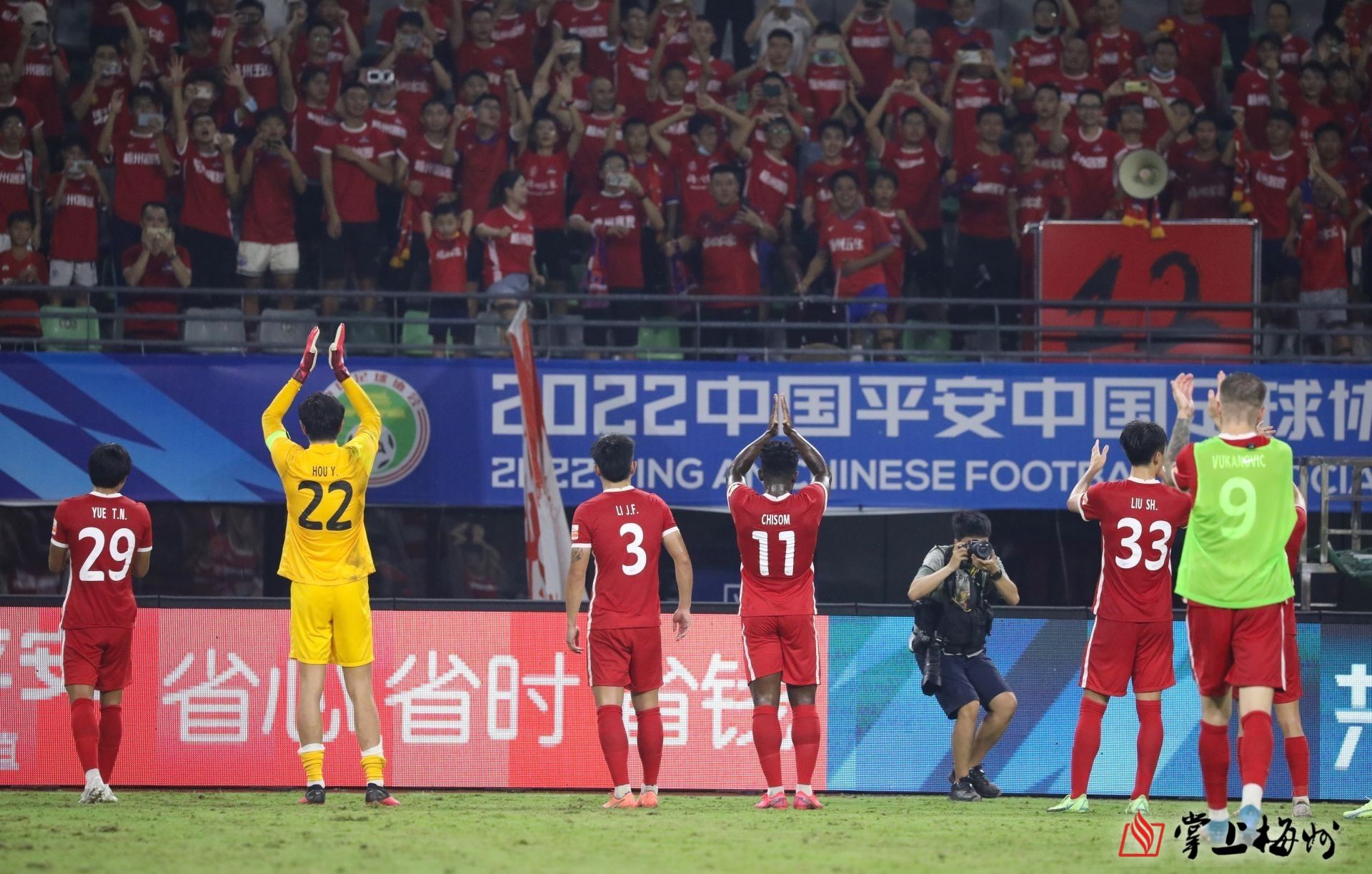 賽后,梅州客家隊球員走向看臺與球迷共同慶祝勝利。