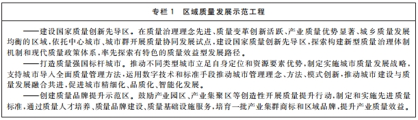 ?。ň牛┐蛟靺^(qū)域質(zhì)量發(fā)展新優(yōu)勢(shì)。加強(qiáng)質(zhì)量政策引導(dǎo),推動(dòng)區(qū)域質(zhì)量發(fā)展與生產(chǎn)力布局、區(qū)位優(yōu)勢(shì)、環(huán)境承載能力及社會(huì)發(fā)展需求對(duì)接融合。推動(dòng)?xùn)|部地區(qū)發(fā)揮質(zhì)量變革創(chuàng)新的引領(lǐng)帶動(dòng)作用,增強(qiáng)質(zhì)量競(jìng)爭(zhēng)新優(yōu)勢(shì),實(shí)現(xiàn)整體質(zhì)量提升。引導(dǎo)中西部地區(qū)因地制宜發(fā)展特色產(chǎn)業(yè),促進(jìn)區(qū)域內(nèi)支柱產(chǎn)業(yè)質(zhì)量升級(jí),培育形成質(zhì)量發(fā)展比較優(yōu)勢(shì)。推動(dòng)?xùn)|北地區(qū)優(yōu)化質(zhì)量發(fā)展環(huán)境,加快新舊動(dòng)能轉(zhuǎn)換,促進(jìn)產(chǎn)業(yè)改造升級(jí)和質(zhì)量振興。健全區(qū)域質(zhì)量合作互助機(jī)制,推動(dòng)區(qū)域質(zhì)量協(xié)同發(fā)展。深化質(zhì)量強(qiáng)省建設(shè),推動(dòng)質(zhì)量強(qiáng)市、質(zhì)量強(qiáng)業(yè)向縱深發(fā)展,打造質(zhì)量強(qiáng)國(guó)建設(shè)標(biāo)桿。