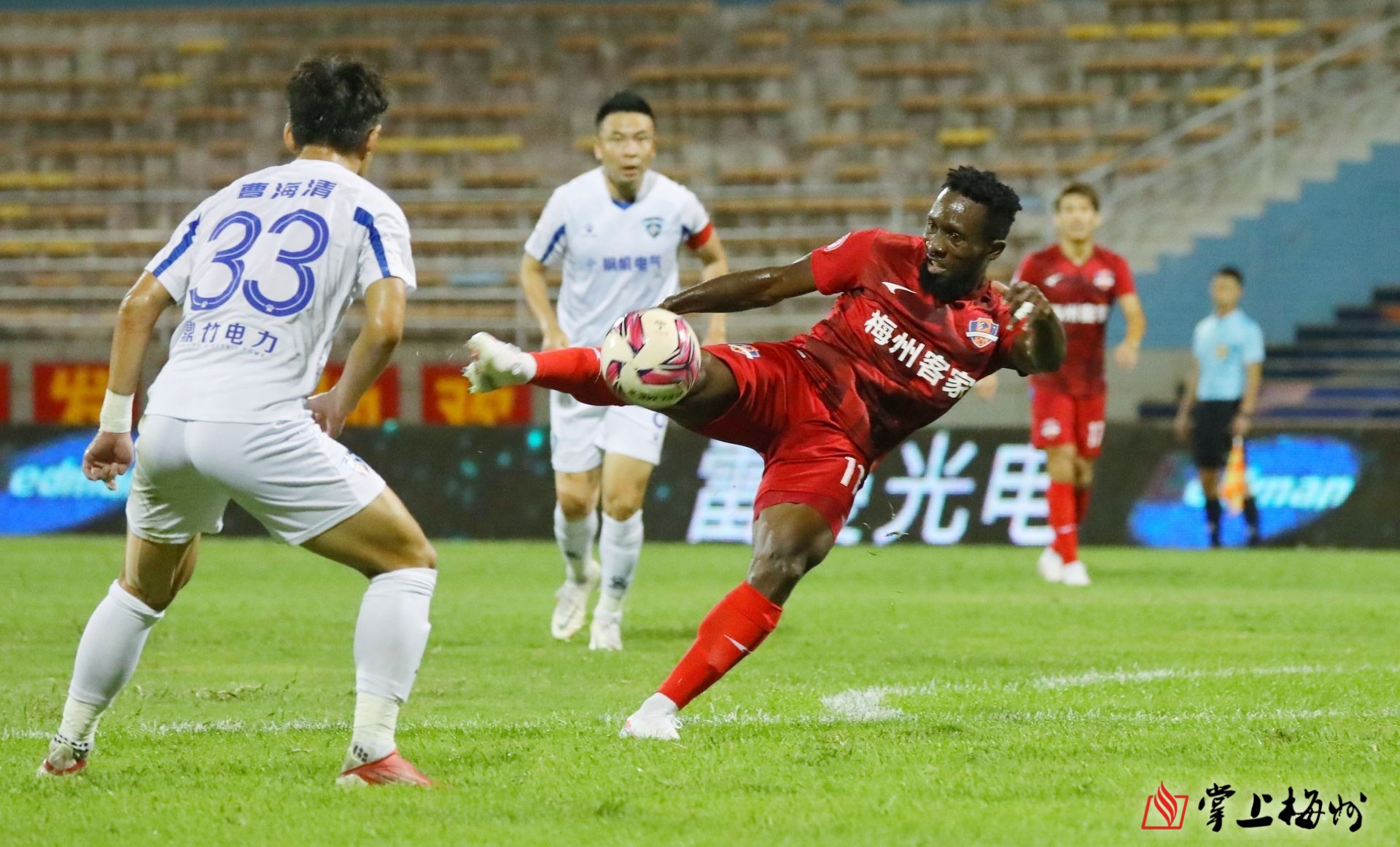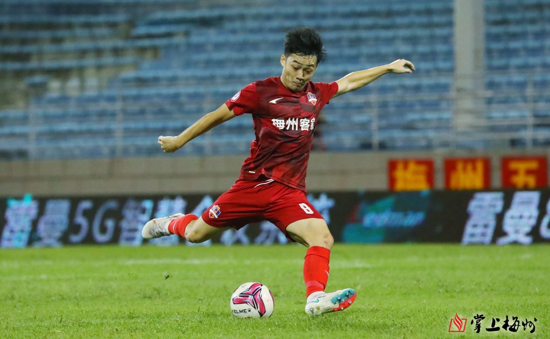 梅州客家隊球員梁學(xué)銘起腳射門。