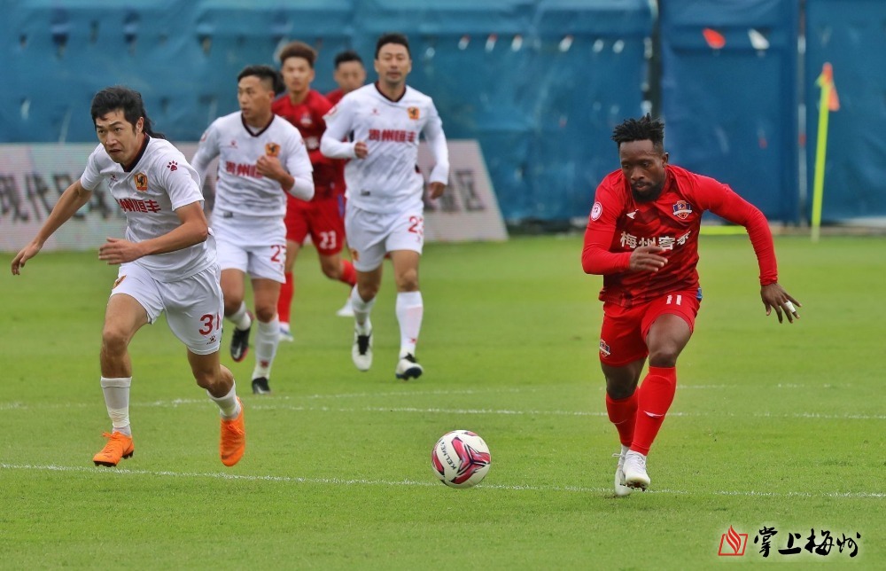 梅州客家隊(duì)球員吉森帶球突破。