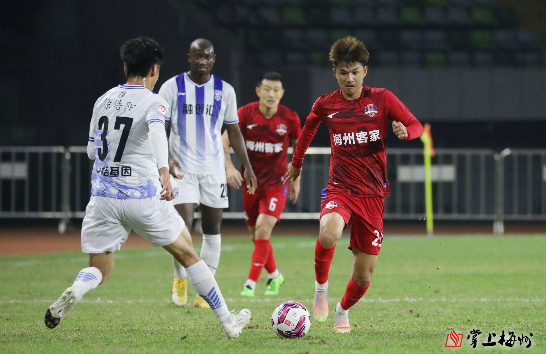 梅州客家隊(duì)球員陳國(guó)抗帶球突破。