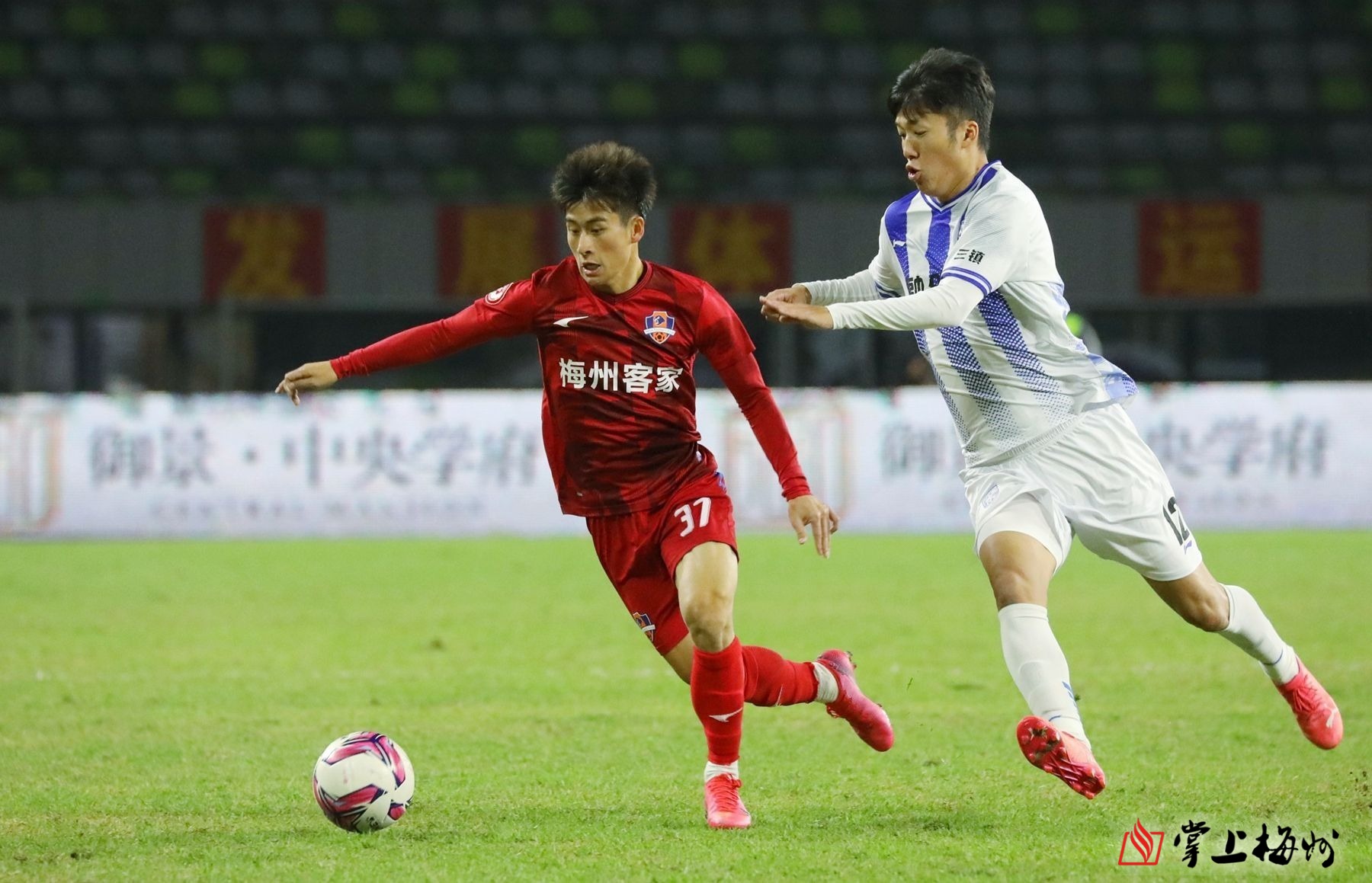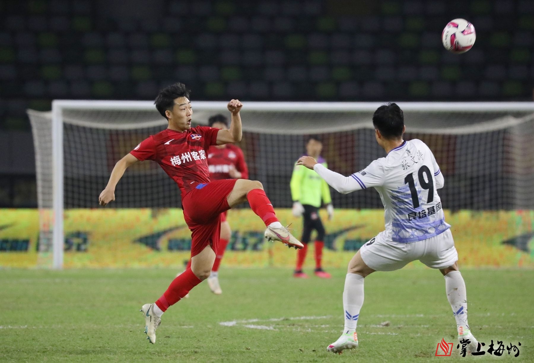 梅州客家隊(duì)球員梁學(xué)銘與對(duì)手拼搶。