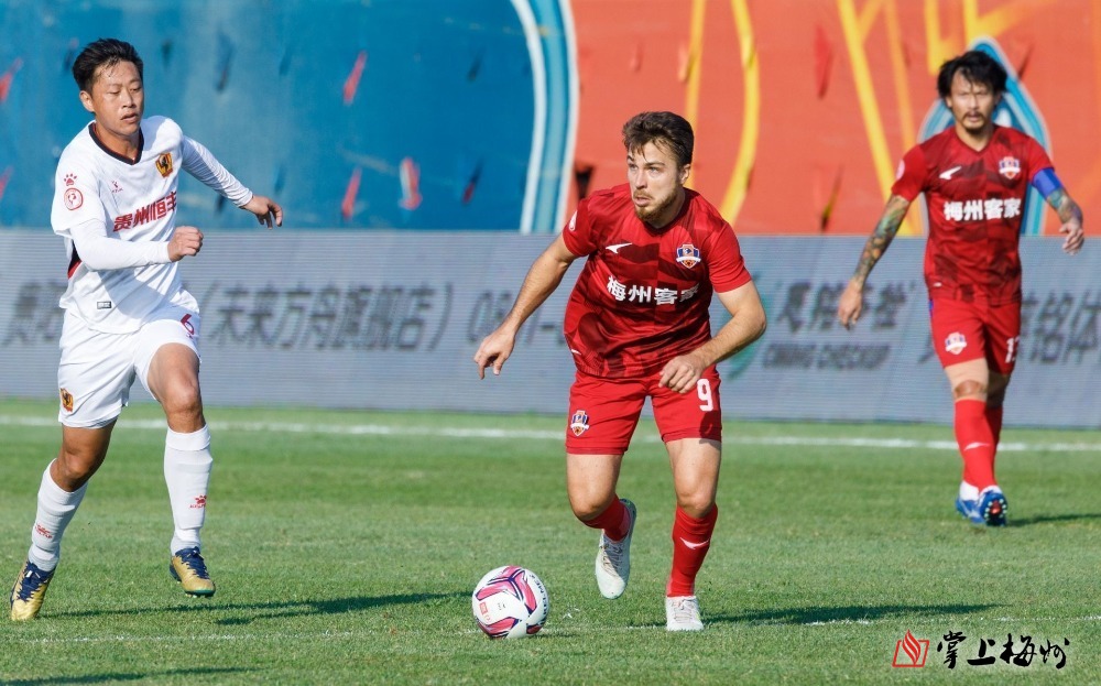 梅州客家隊球員吉森帶球突破。