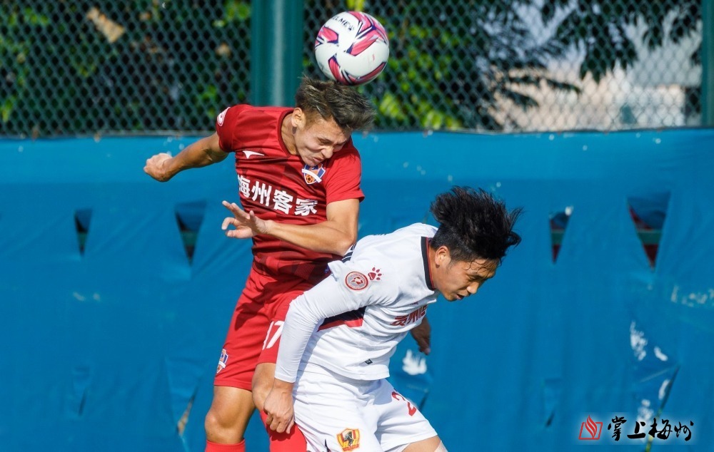 梅州客家隊球員楊一虎與對手爭頂頭球。