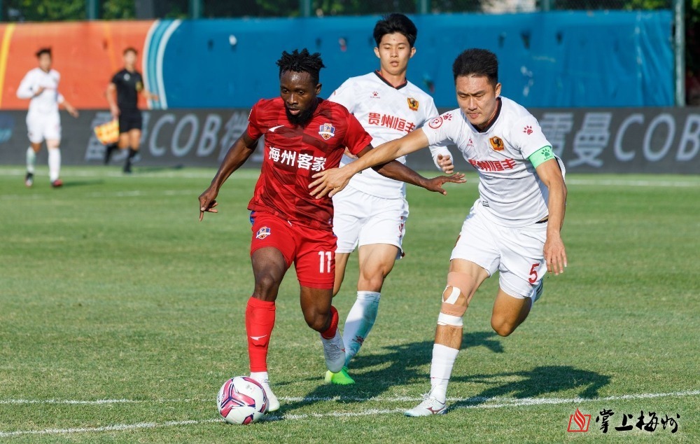 中甲聯(lián)賽第31輪一場焦點戰(zhàn)今天下午3時在橫陂足球小鎮(zhèn)進行,梅州客家隊吉森梅開二度,崔巍、劉盛、郭毅錦上添花,最終以5:0大勝貴州隊,重新登頂積分榜,離成功沖超僅差1分。