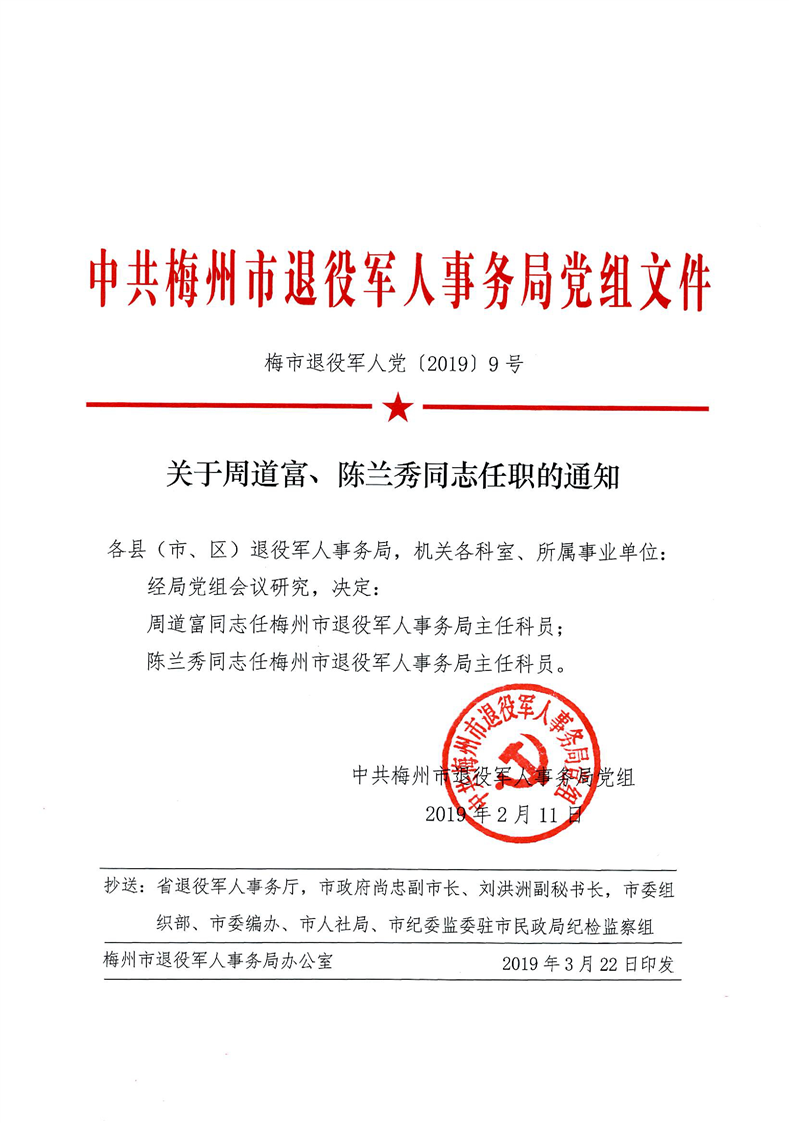 梅州市人民政府門戶網(wǎng)站 梅州市退役軍人事務(wù)局 人事任免 關(guān)于周道富、陳蘭秀同志任職的通知