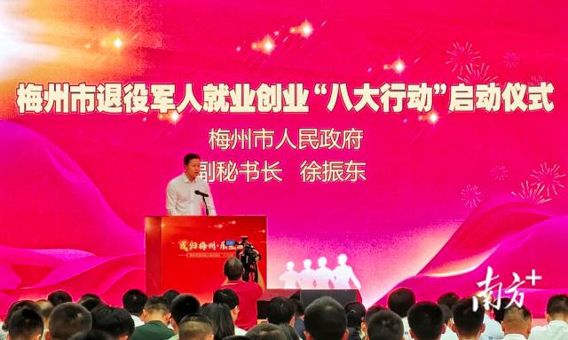 徐振東代表梅州市委、市政府發(fā)表致辭,向服務(wù)退役軍人的工作者、提供支持的企業(yè)和社會(huì)各界致謝,并歡迎退役軍人投身家鄉(xiāng)建設(shè)。他強(qiáng)調(diào),退役軍人就業(yè)創(chuàng)業(yè)是民生工程,更是政治任務(wù)。退役軍人就業(yè)創(chuàng)業(yè)“八大行動(dòng)”既是市委、市政府落實(shí)省政府工作部署,開(kāi)展促進(jìn)退役軍人高質(zhì)量就業(yè)創(chuàng)業(yè)的具體舉措,也是做好退役軍人就業(yè)服務(wù)保障,助力“百千萬(wàn)工程”的深入實(shí)踐,必將推動(dòng)梅州市退役軍人就業(yè)創(chuàng)業(yè)工作邁上新臺(tái)階。一是擔(dān)當(dāng)作為,擦亮退役軍人就業(yè)創(chuàng)業(yè)“梅州品牌”。各部門(mén)務(wù)必堅(jiān)決扛起穩(wěn)就業(yè)、保就業(yè)的重任,將破解退役軍人結(jié)構(gòu)性就業(yè)矛盾作為工作著力點(diǎn),尤其聚焦退役軍人群體,以實(shí)現(xiàn)其高質(zhì)量充分就業(yè)為目標(biāo),扎實(shí)推進(jìn)“八大行動(dòng)”的各項(xiàng)舉措,完善“一人一檔”動(dòng)態(tài)幫扶機(jī)制,推動(dòng)工作模式從“輸血式幫扶”向“造血式賦能”轉(zhuǎn)變。二是要用心服務(wù),書(shū)寫(xiě)退役軍人就業(yè)創(chuàng)業(yè)“梅州答卷”。各部門(mén)以及各培訓(xùn)機(jī)構(gòu)應(yīng)著重聚焦培訓(xùn)行動(dòng),緊密對(duì)接技能培訓(xùn)與企業(yè)需求,幫助退役軍人提升職業(yè)技能,打造具備軍事化特色的培訓(xùn)平臺(tái)。各級(jí)退役軍人事務(wù)部門(mén)要深化并拓展 “拓崗行動(dòng)”,營(yíng)造出專屬于退役軍人的就業(yè)新風(fēng)尚,建好“15分鐘就業(yè)服務(wù)圈”,讓優(yōu)質(zhì)崗位觸手可及。稅務(wù)、金融監(jiān)管部門(mén)以及各金融機(jī)構(gòu)需積極推進(jìn)專項(xiàng)服務(wù)行動(dòng),扎實(shí)落實(shí)稅收優(yōu)惠政策,全方位為退役軍人就業(yè)創(chuàng)業(yè)提供堅(jiān)實(shí)有力的支持。三是合作共贏,打造退役軍人就業(yè)創(chuàng)業(yè)“梅州樣板”。熱情歡迎廣大軍創(chuàng)企業(yè)、雙擁企業(yè)投資梅州、扎根梅州,歡迎廣大退役軍人踴躍投身家鄉(xiāng)建設(shè)。希望各企業(yè)積極踐行社會(huì)責(zé)任,提供優(yōu)質(zhì)崗位,與退役軍人攜手打造一批具有影響力的“軍字號(hào)”標(biāo)桿項(xiàng)目和品牌。市委、市政府也將一如既往地做好服務(wù)保障工作,積極協(xié)調(diào)各方資源,優(yōu)化政策環(huán)境,為企業(yè)發(fā)展以及退役軍人就業(yè)創(chuàng)業(yè)搭建堅(jiān)實(shí)橋梁。