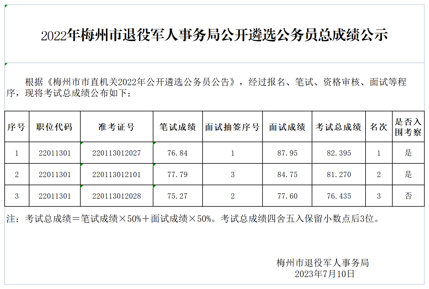 梅州市人民政府門戶網(wǎng)站 梅州市退役軍人事務局 通知公告 2022年梅州市退役軍人事務局公開遴選公務員總成績公示