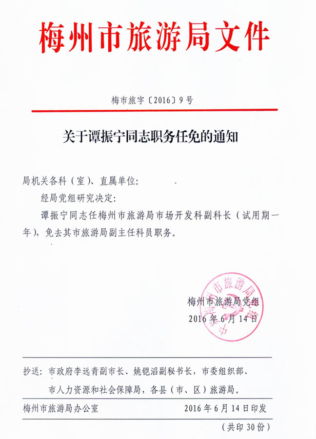 梅市旅字【2016】9號 關(guān)于譚振寧同志職務(wù)任免的通知