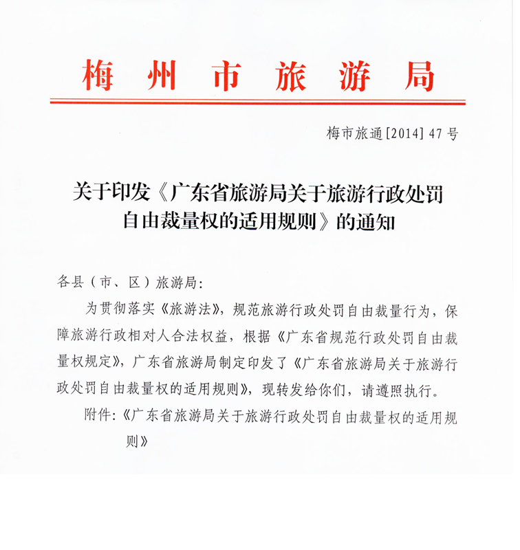 梅州市人民政府門戶網(wǎng)站 梅州市文化廣電旅游局 部門文件 關(guān)于印發(fā)《廣東省旅游局關(guān)于旅游行政處罰自由裁量權(quán)的適用規(guī)則》的通知