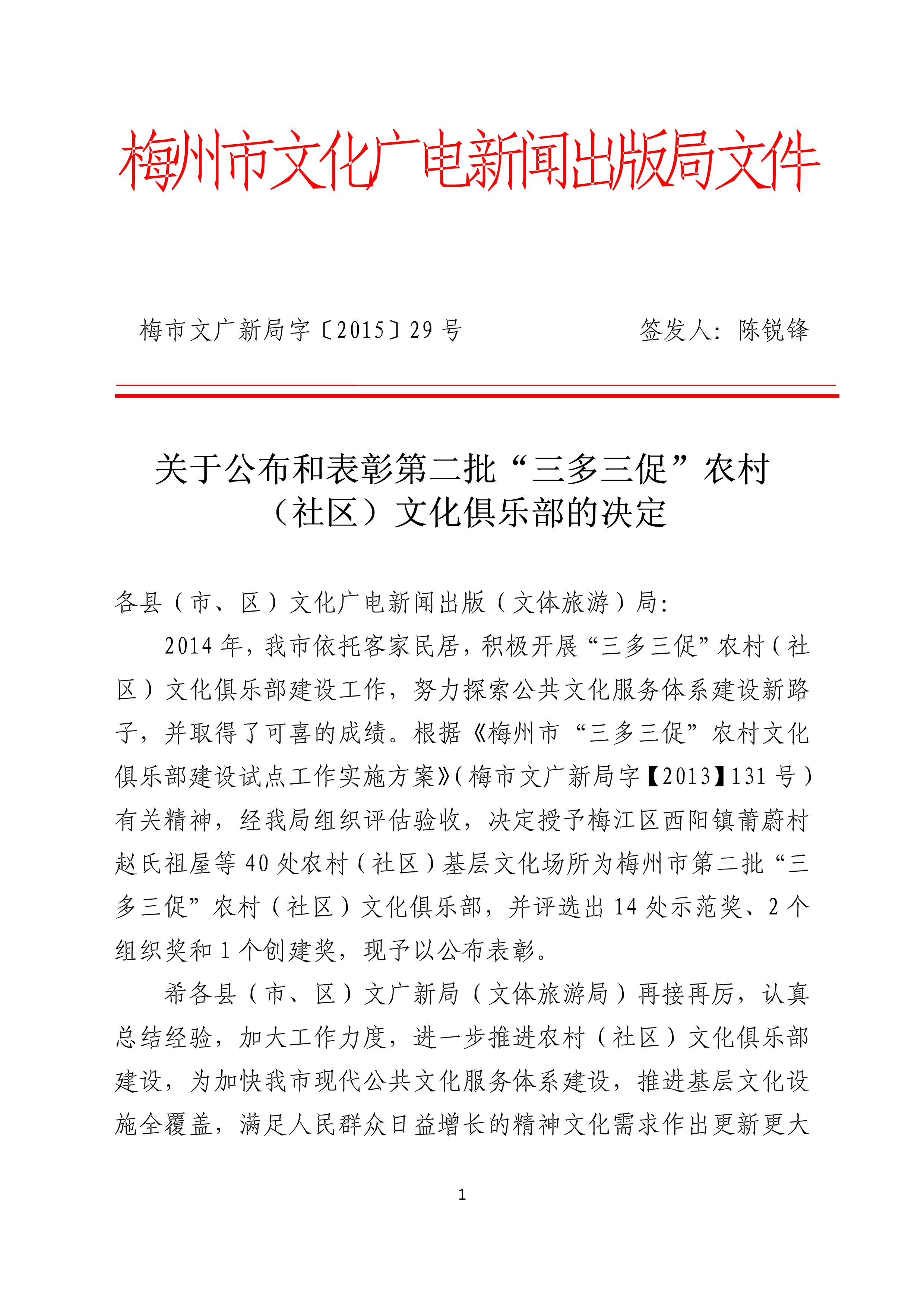 梅州市人民政府門戶網(wǎng)站 梅州市文化廣電旅游局 部門文件 關于公布和表彰第二批“三多三促”農村