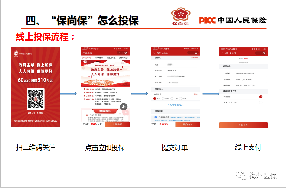 即日起,參保人可通過微信公眾號“保尚?!边M(jìn)行投保繳費(fèi),也可以到人保財(cái)險(xiǎn)各營業(yè)網(wǎng)點(diǎn)或合作代理網(wǎng)點(diǎn)投保,可用微信支付或者使用醫(yī)保個人賬戶余額支付。更加貼心的政策是,投保人跟被保險(xiǎn)人可以不是同一人,符合規(guī)定條件的參保人可用個賬余額為本人及家人購買“保尚?!?。