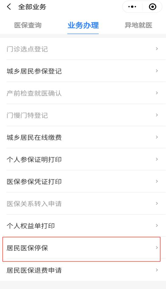 “業(yè)務(wù)辦理”中點(diǎn)擊“查看更多”,后點(diǎn)擊“居民醫(yī)保停?!边M(jìn)入操作頁面。