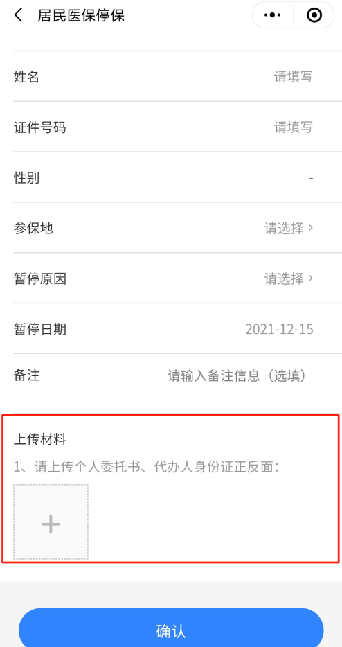 (四)填寫申辦醫(yī)保停保業(yè)務(wù)所需信息,需要注意的是,需上傳停保人個(gè)人委托書及代辦人身份證正反面,完成后點(diǎn)擊確認(rèn)。
