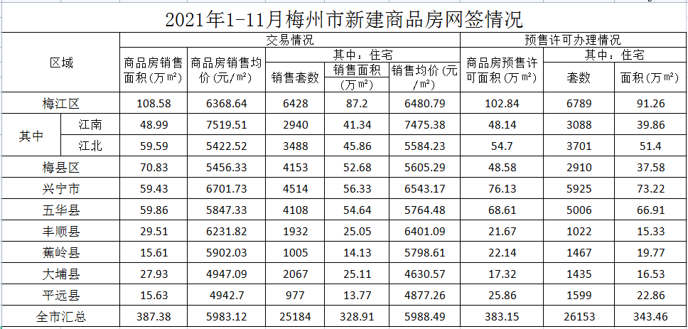 梅州市人民政府門戶網(wǎng)站 梅州市住房和城鄉(xiāng)建設(shè)局 房地產(chǎn)業(yè) 2021年1-11月梅州市新建商品房網(wǎng)簽情況