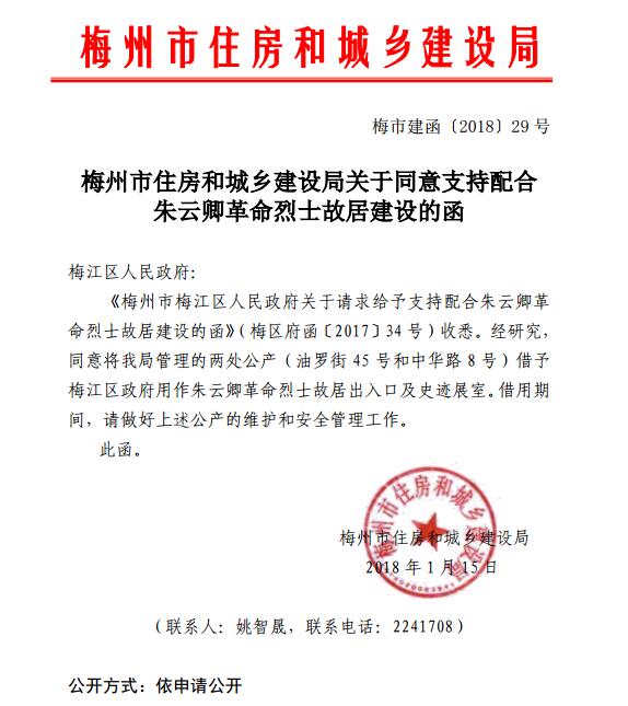 梅州市住房和城鄉(xiāng)建設(shè)局關(guān)于同意支持配合朱云卿革命烈士故居建設(shè)的函