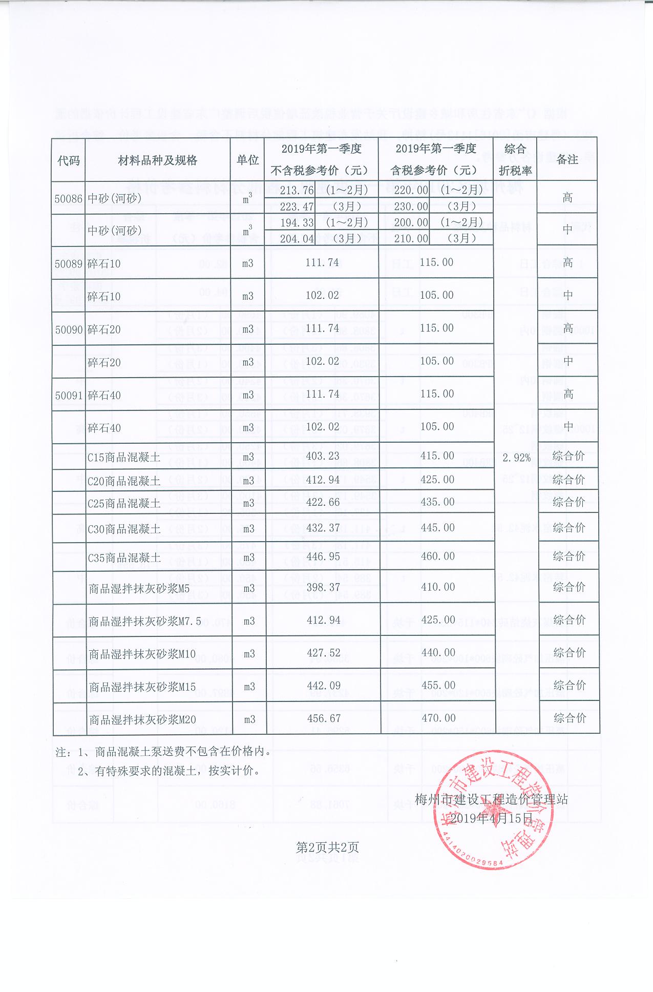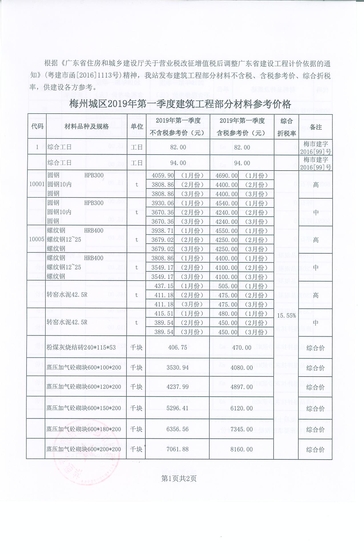梅州市人民政府門戶網(wǎng)站 梅州市住房和城鄉(xiāng)建設局 建筑業(yè)管理 梅州城區(qū)2019年第一季度建筑工程部分材料參考價格
