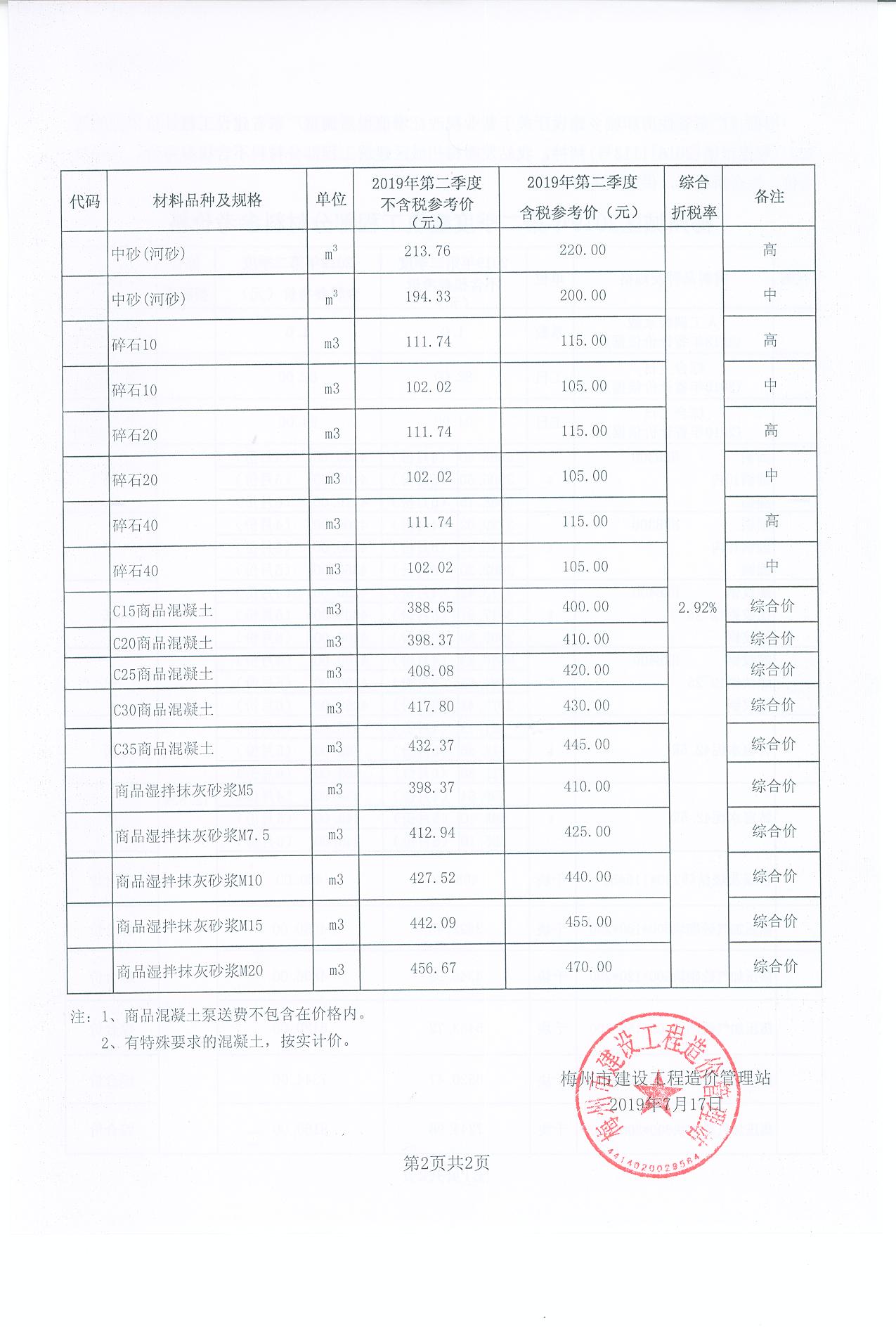 梅州城區(qū)2019年第二季度建筑工程部分材料參考價(jià)格