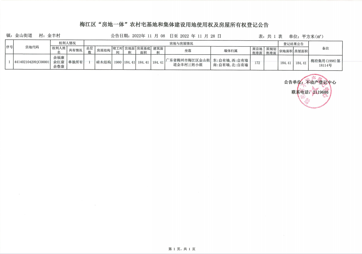 梅江區(qū)“房地一體”農村宅基地和集體建設用地使用權及房屋所有權登記公告