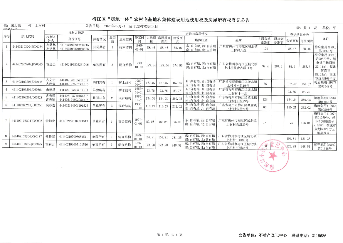 梅江區(qū)“房地一體”農(nóng)村宅基地和集體建設(shè)用地使用權(quán)及房屋所有權(quán)登記公告