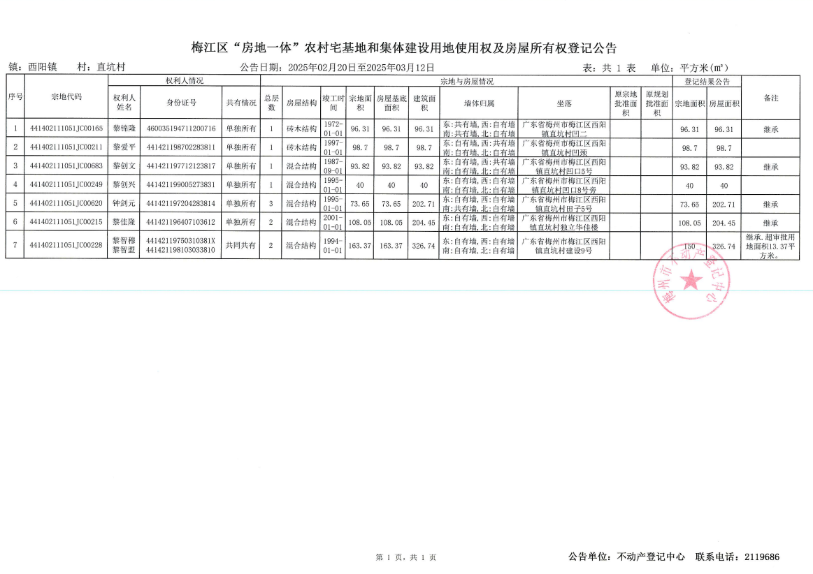梅江區(qū)“房地一體”農(nóng)村宅基地和集體建設(shè)用地使用權(quán)及房屋所有權(quán)登記公告
