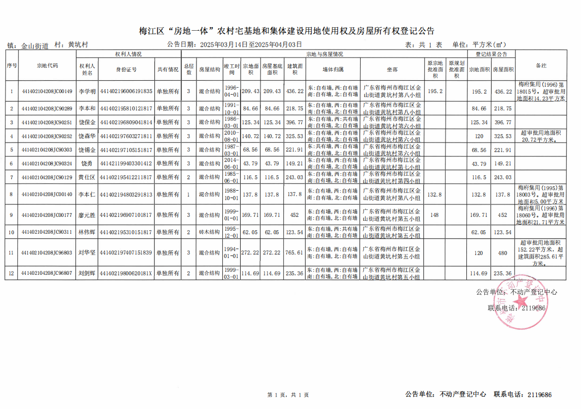 梅江區(qū)“房地一體”農(nóng)村宅基地和集體建設(shè)用地使用權(quán)及房屋所有權(quán)登記公告