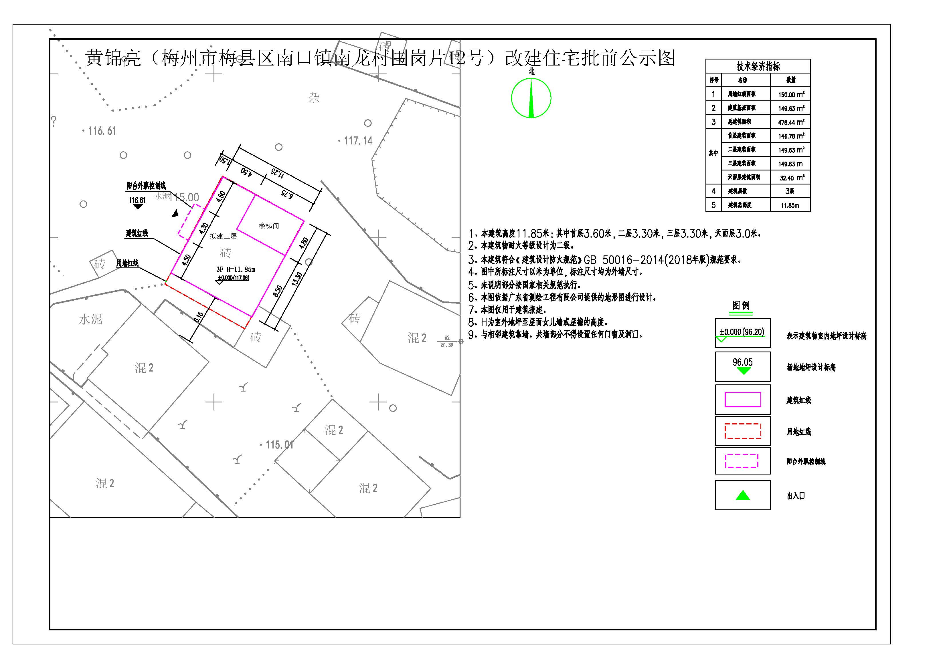 黃錦亮原房屋位于梅州市梅縣區(qū)南口鎮(zhèn)南龍村圍崗片12號(hào),現(xiàn)黃錦亮業(yè)主擬對(duì)梅州市梅縣區(qū)南口鎮(zhèn)南龍村圍崗片12號(hào)房屋進(jìn)行改建。具體報(bào)建方案為:建筑基底面積:149.63平方米,層數(shù):3層及天面樓梯間,總建筑面積:478.44平方米。本圖僅為示意圖,準(zhǔn)確數(shù)據(jù)以最后審批為準(zhǔn)。