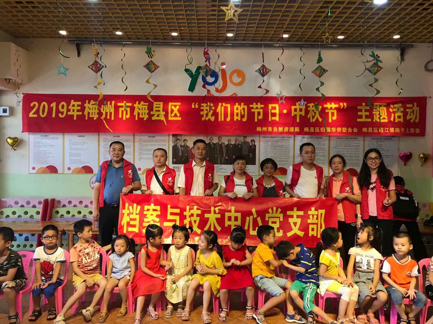 2019年9月10日上午,市自然資源局檔案與技術(shù)中心黨支部全體黨員一早來(lái)到梅縣區(qū)程江鎮(zhèn)崗子上居委會(huì)新貴街太陽(yáng)花幼兒園與小朋友們進(jìn)行主題為“傳承中華文化,共過(guò)我們的節(jié)日--中秋節(jié)”創(chuàng)文志愿者活動(dòng)。黨員同志與居委干部一起,向小朋友介紹中秋節(jié)的來(lái)歷,與小朋友一起開(kāi)展互動(dòng)游戲,并向小朋友們贈(zèng)送了一批文具。