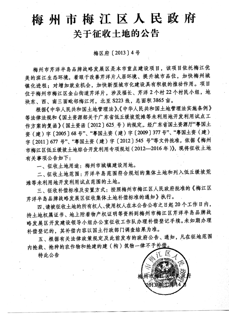 梅州市人民政府門戶網(wǎng)站 梅州市自然資源局 征地公告 芹洋征地公告